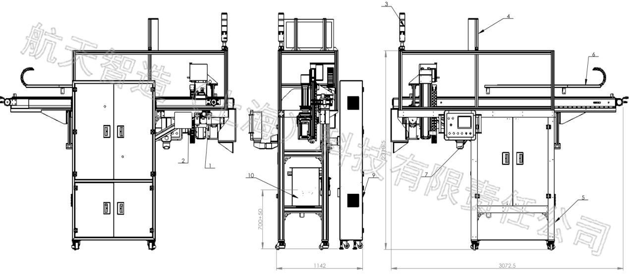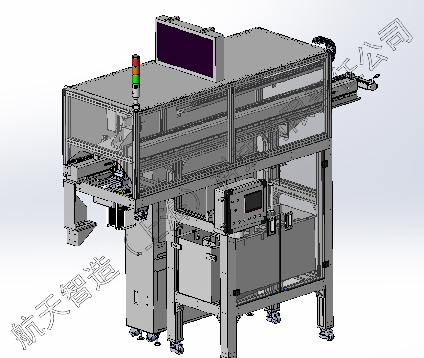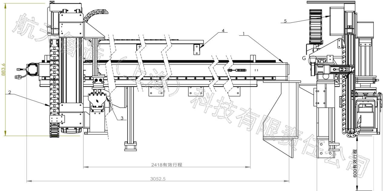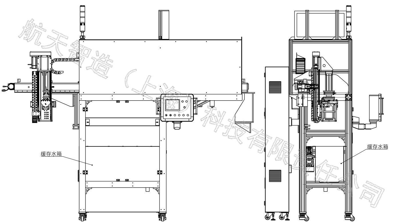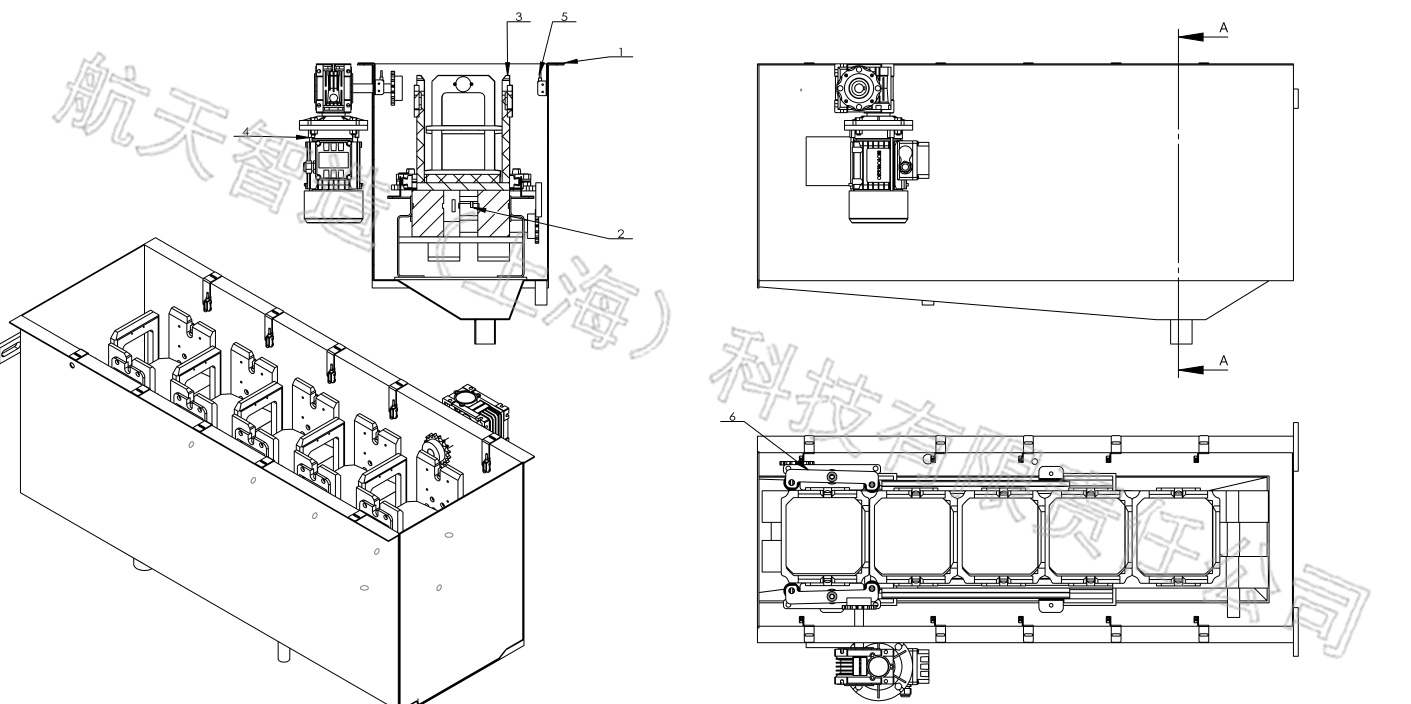 硅片單片很薄、堅(jiān)硬、脆,考慮工況水質(zhì)浸泡的環(huán)境治具要變形小。治具材料采用硬PVC材料阻燃,硬度高,韌性好,吸濕小。按8寸硅片尺寸設(shè)計(jì)內(nèi)框限位,單邊放4mm間隙。承載量為800片硅片設(shè)計(jì)治具高度和承載力,安裝板螺紋底孔內(nèi)嵌螺紋鋼套。底板設(shè)計(jì)清洗分片機(jī)的定位孔,入口孔帶倒角方便引導(dǎo)。底板四角設(shè)計(jì)內(nèi)圓弧角,用于前后治具跟進(jìn)時(shí)的隔斷。左右側(cè)板設(shè)計(jì)機(jī)械手抓取前的限位導(dǎo)向,當(dāng)機(jī)械手下降時(shí)自動(dòng)導(dǎo)正治具后到位抓取。斜度板設(shè)計(jì)角度符合清洗分片的角度。抓板設(shè)計(jì)同時(shí)滿足人工和機(jī)械手搬運(yùn)。后板設(shè)計(jì)要挖空,方便人工放置硅片操作。后板并設(shè)計(jì)有RFID芯片安裝位。 圖二硅片載體治具示意圖 1.底板 2.側(cè)板3.斜度板4.抓板5.后板 機(jī)械手設(shè)計(jì) 機(jī)械手系統(tǒng)由氣動(dòng)控制組件、接線盒、三色燈報(bào)警器、LED顯示器、機(jī)架框架、機(jī)械手桁架組件、觸摸屏控制組件、保護(hù)罩殼、控制電箱、治具緩存水箱組成。如圖三所示。氣動(dòng)控制組件和接線盒方便于能源接入。三色燈報(bào)警器時(shí)時(shí)動(dòng)態(tài)顯示設(shè)備狀態(tài),便于維護(hù)。LED顯示器主要顯示設(shè)備的料號(hào)信息。機(jī)架框架設(shè)計(jì)滿足機(jī)械手桁架組件和治具緩存水箱的安裝和承載??蚣苤С懈叨燃骖櫇M載治具輸送、治具緩存水箱、清洗分片位、空治具回流輸送功能需求。機(jī)械手桁架組件設(shè)計(jì)滿足硅片滿載治具的輸送、緩存、清洗分片位的上料、空治具回的流橫移和上下料的承載、行程。觸摸屏控制組件設(shè)計(jì)有自動(dòng)和手動(dòng)模式,方便調(diào)試、維護(hù)、管理。保護(hù)罩殼將機(jī)械運(yùn)動(dòng)機(jī)構(gòu)做安全防護(hù),防止意外。治具緩存水箱設(shè)計(jì)防止一刀料全部到齊,造成輸送線體堵車作為緩存。緩存位物料少于2件時(shí)啟動(dòng)叫料考慮中間環(huán)節(jié)備料時(shí)間。 圖三機(jī)械手系統(tǒng)示意圖 1.氣動(dòng)控制組件2.接線盒3.三色燈報(bào)警器4.LED顯示器5.機(jī)架框架6.機(jī)械手桁架組件7.觸摸屏控制組件8.保護(hù)罩殼9.控制電箱10治具緩存水箱 (1)桁架機(jī)械手組件設(shè)計(jì) 桁架機(jī)械手由橫移移栽模組、垂直移栽模組、機(jī)械手組件、拖鏈組件、接線盒組成。如圖四所示。橫移移栽模組行程滿足現(xiàn)場(chǎng)布局,移栽橫移位涉及滿載治具輸送、治具緩存水箱、清洗分片位、空治具回流輸送的精確位置,采用伺服電機(jī)驅(qū)動(dòng)。移載行程范圍內(nèi)設(shè)計(jì)零點(diǎn)、左右兩邊的極限位、中間設(shè)置加減速感應(yīng)位。橫梁采用型材鋼結(jié)構(gòu),導(dǎo)軌安裝為T(mén)型安裝方式,安裝面貼板焊接加工保持平行度和垂直度。移栽極限位設(shè)計(jì)機(jī)械硬限位。牽引方式采用皮帶。 圖四桁架機(jī)械手示意圖 1.橫移移栽模組2.垂直移栽模組3.機(jī)械手組件4.拖鏈組件5.接線盒 垂直移栽模組高度行程涉及滿載治具輸送、治具緩存水箱、清洗分片上料位、空治具回流輸送系統(tǒng)。設(shè)計(jì)時(shí)除清洗分片上料位高度外,其余高度設(shè)計(jì)一致。高度的行程以最低點(diǎn)容許富余量50mm。由于高度不同垂直提升采用抱閘伺服電機(jī)驅(qū)動(dòng)。提升機(jī)構(gòu)設(shè)計(jì)為導(dǎo)軌滑塊和滾珠絲桿方式。移載行程范圍內(nèi)設(shè)計(jì)零點(diǎn)、上下兩邊的極限位、中間設(shè)置加減速感應(yīng)位。 (2)治具緩存水箱設(shè)計(jì) 治具緩存水箱放置在機(jī)械手橫移框架內(nèi)并固定。如圖五所示。緩存水箱的線體中心位置與機(jī)械手移載中心位置重合。機(jī)械手將輸送線體的滿載治具緩存在水箱中。治具緩存水箱由水箱本體、水下輸送線體、物料檢測(cè)、截停機(jī)構(gòu)組成。 圖五緩存水箱安裝位示意圖 水箱材料采用不銹鋼鈑金,拼接焊接而成密封不能漏水。水箱設(shè)計(jì)有進(jìn)水口和排水口方便水定時(shí)更換且設(shè)有液位傳感器。水箱外有與框架固定的安裝板。水箱內(nèi)安裝有輸送線體,用于輸送治具。水箱上料位設(shè)計(jì)有料感應(yīng),感應(yīng)有料啟動(dòng)輸送。水箱內(nèi)可以緩存4個(gè)治具位置加1個(gè)放料位滿足5個(gè)治具位置尺寸空間。每處位置都有有料感應(yīng),防止?jié)M料放料或疊料。輸送前端設(shè)計(jì)有截停機(jī)構(gòu),當(dāng)治具到上料抓取位時(shí)截停機(jī)構(gòu)啟動(dòng)阻斷緊跟后面的治具,防止抓取提升帶起。 圖六緩存水箱結(jié)構(gòu)示意圖 1.水箱本體2.水下輸送線體3.治具4.輸送驅(qū)動(dòng)5.物料檢測(cè)6.截停機(jī)構(gòu)治具 03 推 廣 前 景 和 結(jié) 論 本文設(shè)計(jì)的一款硅片載體治具自動(dòng)上料機(jī)械手,在整體車間13條清洗線實(shí)施后,硅片脫膠和清洗前的分裝、搬運(yùn)、分配、上料環(huán)節(jié)中實(shí)現(xiàn)了僅在硅片脫膠后往治具分裝硅片需人工作業(yè),大大減輕了勞動(dòng)強(qiáng)度。不同型號(hào)的硅片清洗對(duì)應(yīng)的不同清洗設(shè)備可以在產(chǎn)線中實(shí)現(xiàn)