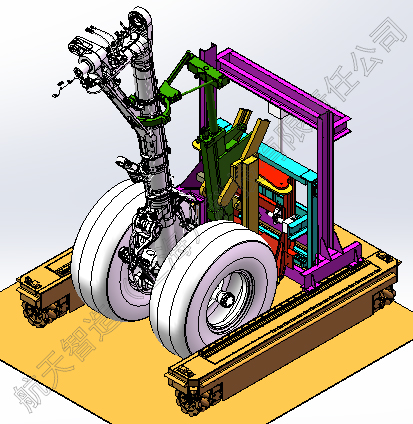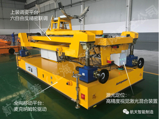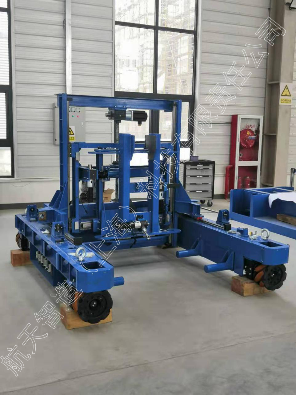 該項(xiàng)目為某大型客機(jī)專門定制的起落架安裝裝置,采用麥克納姆輪做為移動(dòng)機(jī)構(gòu)可任意方向高精度的移動(dòng),配置六自由度調(diào)姿機(jī)構(gòu)完成精確安裝對(duì)接。全向移動(dòng)平臺(tái)采用我司成熟的麥克納姆輪技術(shù),能夠?qū)崿F(xiàn)高精度、零回轉(zhuǎn)半徑的全向移動(dòng),由于在起落架安裝環(huán)節(jié)現(xiàn)場(chǎng)空間比較小,裝配環(huán)境復(fù)雜,用麥克納姆輪組作為移動(dòng)機(jī)構(gòu)可以完全解決這個(gè)問題;調(diào)姿部分以伺服電機(jī)控制用于實(shí)現(xiàn)精確的六自由度調(diào)姿,以便于在起落架安裝時(shí)實(shí)時(shí)精準(zhǔn)的調(diào)整安裝位置。