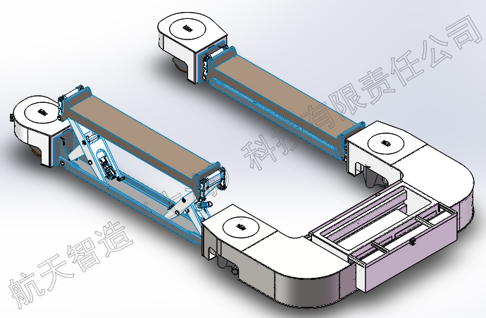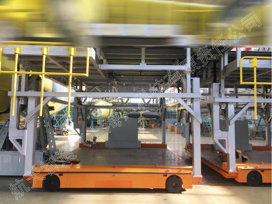 機(jī)塢AGV平臺(tái)的設(shè)計(jì)制造可以滿足飛機(jī)總裝生產(chǎn)過程中,機(jī)頭、機(jī)身、機(jī)翼及尾段各部位的安裝工作,為操作人員提供高空作業(yè)工作平臺(tái),根據(jù)工作需要電控移動(dòng)和改變升降高度對(duì)整機(jī)進(jìn)行工作平臺(tái)的設(shè)計(jì);整體工作平臺(tái)分為:雷達(dá)艙工作梯、風(fēng)擋雨刷工作、機(jī)翼工作平臺(tái)、尾段工作平臺(tái)、罩體工作平臺(tái)、前登機(jī)門工作、前應(yīng)急門登機(jī)、后登機(jī)門登機(jī)、起落架工作梯、機(jī)艙內(nèi)工作梯,所有工作平臺(tái)入位后對(duì)合包圍飛機(jī),機(jī)翼平臺(tái)分為三段,采用我司自主研發(fā)的三車聯(lián)動(dòng)控制來實(shí)現(xiàn)整體或分段的移動(dòng),平臺(tái)上集成生產(chǎn)用工具、物料放置架、生產(chǎn)所需動(dòng)力源、數(shù)據(jù)源接口、垃圾投放通道等功能。大翼和尾段工作平臺(tái)采用全向輪移動(dòng),所有工作平臺(tái)根據(jù)現(xiàn)有廠房尺寸合理布局,能快速移動(dòng),方便飛機(jī)進(jìn)出機(jī)庫。